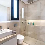 ملحقات الحمام تتضمن المرحاض المنفصل وحوض الاستحمام والدوش.